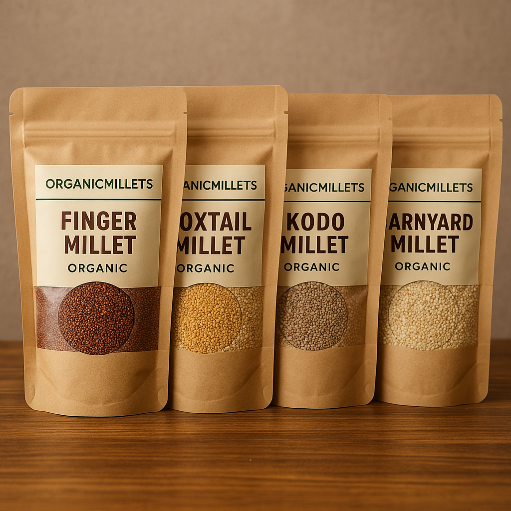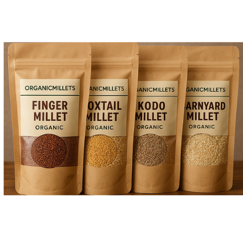 Organic millets are grown without synthetic pesticides, fertilizers, or genetically modified organisms (GMOs). Compared to conventionally grown millets, organic ones are cultivated using natural farming practices, making them more eco-friendly and free from chemical residues.